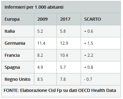 L’Italia è fanalino di coda tra i Paesi Ocse per quanto riguarda il numero di infermieri su 1.000 abitanti. In più, alcune regioni hanno dovuto ridurre drasticamente le loro dotazioni in termini di posti letto, andando ad inficiare gli standard quantitativi e qualitativi relativi all’assistenza ospedaliera. Di questi dati si è parlato lo scorso anno durante la conferenza stampa di presentazione della ricerca “Lo stato del sistema sanitario e dei servizi di cura al cittadino. I numeri dell’emergenza”, a cura del centro studi CISL FP, che è stata anche l’occasione per ufficializzare la costituzione del nuovo Coordinamento Nazionale delle Professioni Sanitarie